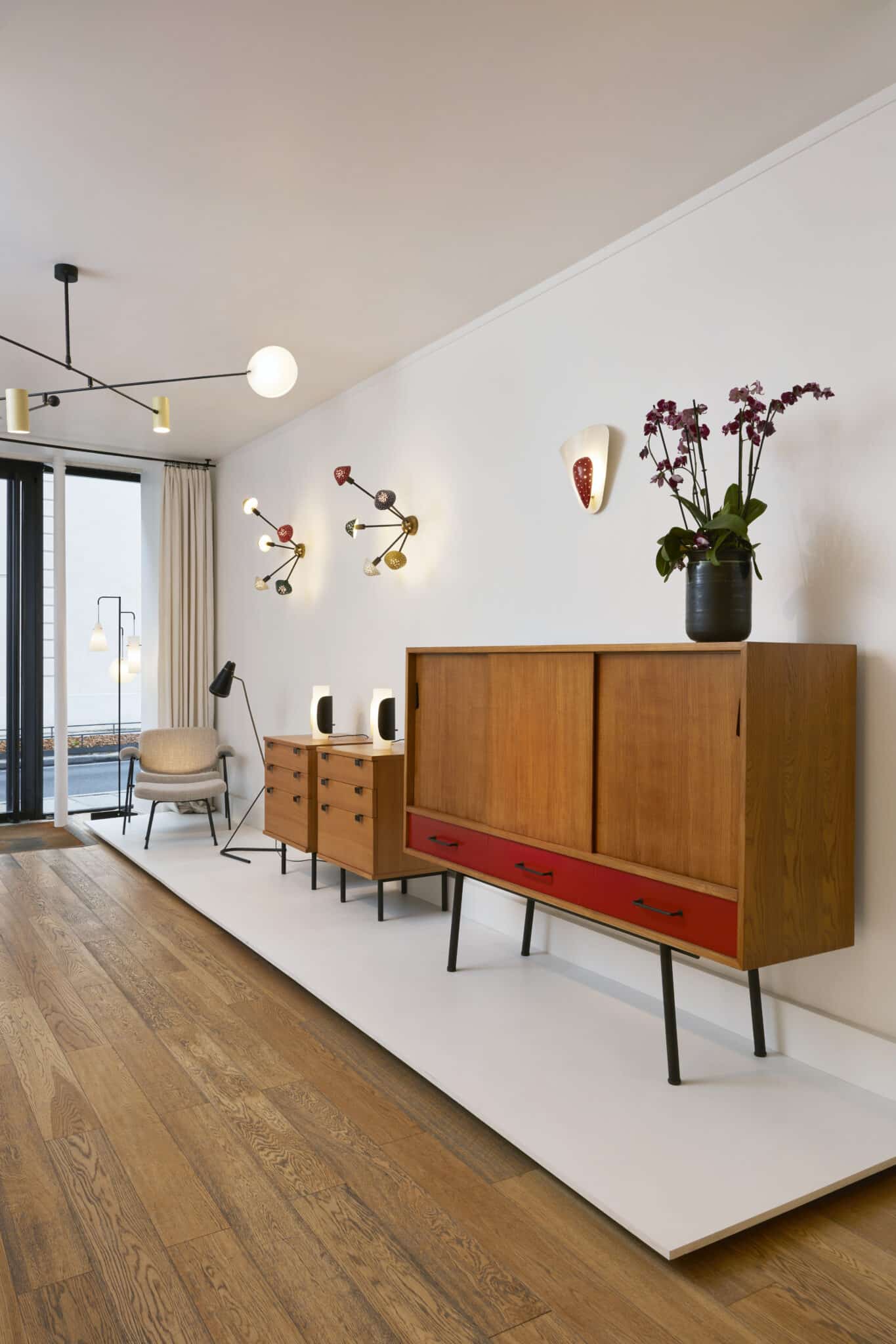 Métal laqué noir, orme, tiroirs laqués rouge