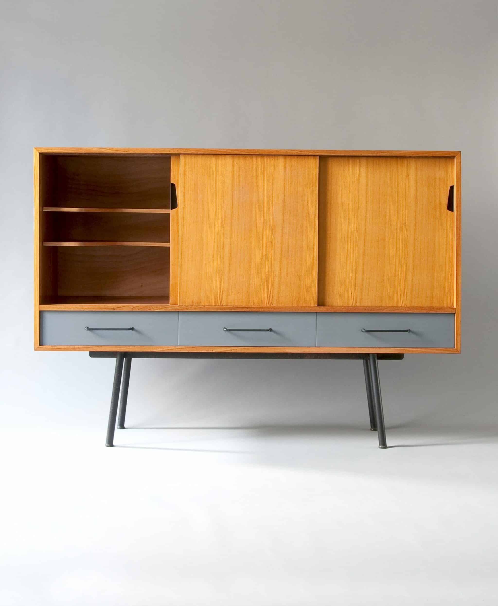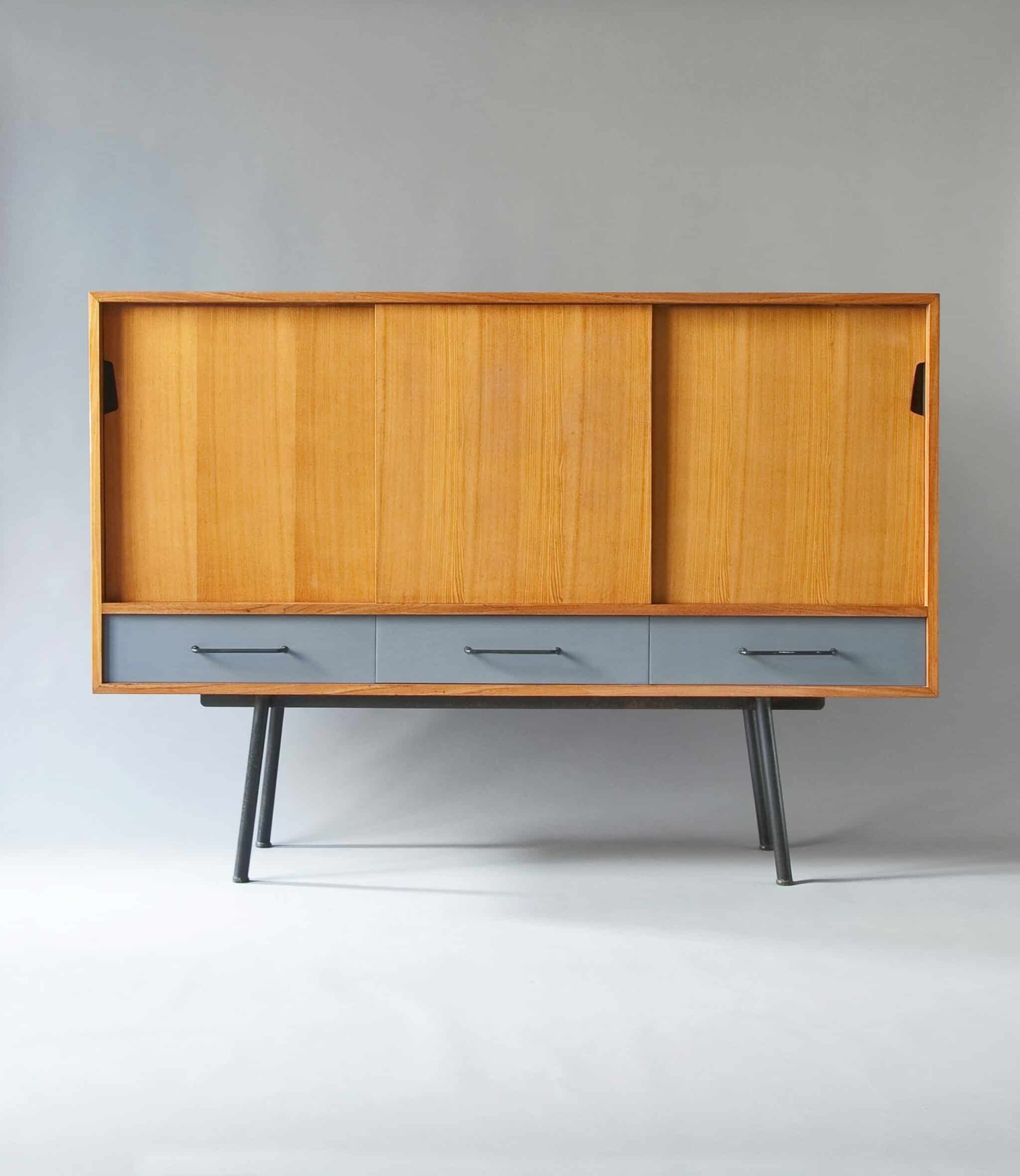 Métal laqué noir, acajou du Honduras, tiroirs laqués gris