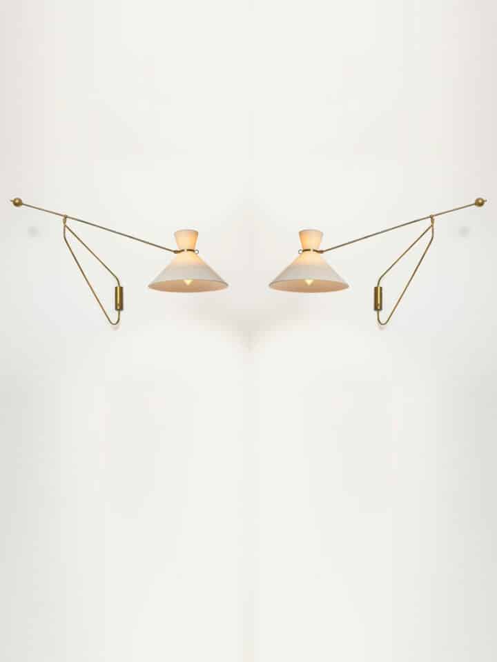 Graduating from Ecole Boulle in 1938, Robert Mathieu was one of the best lighting designers and producers in France in the 1950s. He set up at number 98, boulevard Charonne as a manufacturer of clocks and began designing lighting in 1949. He also produced a little with, for example, a few sublime pieces by Michel Buffet from 1950. Under the name “R. Mathieu Luminaires Rationnels” he developed three main ranges of lights: The first was produced from 1950/1951 around a double lampshade system (the diabolo) in gilded brass. The second, from 1953, used lacquered aluminium reflectors on ceiling lights, lamps and wall lights. In 1956-1958, he invented a complete range of wall and ceiling lights and lamps with lacquered grey metal counterweights, and white Perspex cone reflectors. Other less upscale series followed in the 1960s in glass and teak, in line with the trend for mass-produced Scandinavian furniture. A large part of his production resources was dedicated to special orders. He stopped producing in 1978.