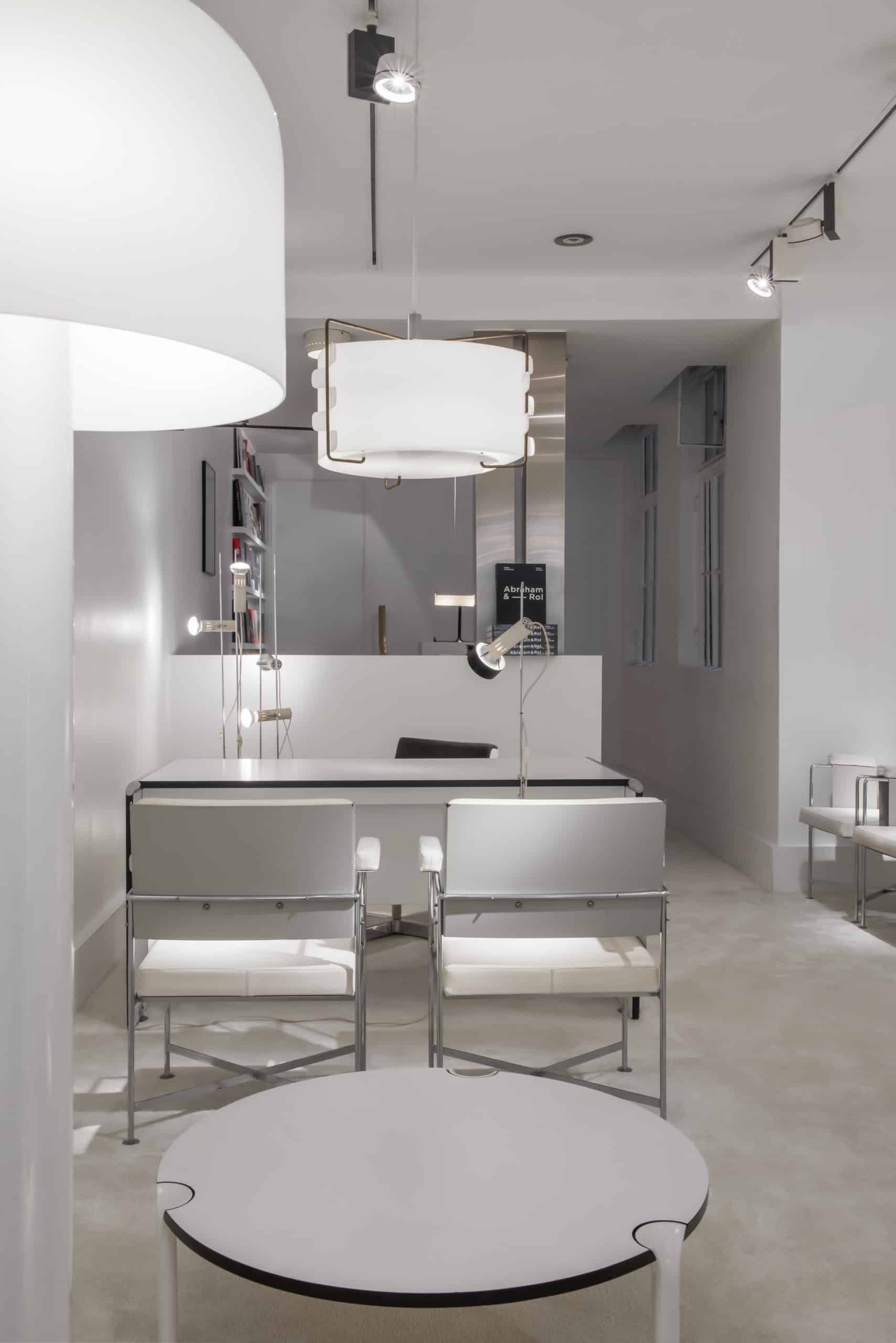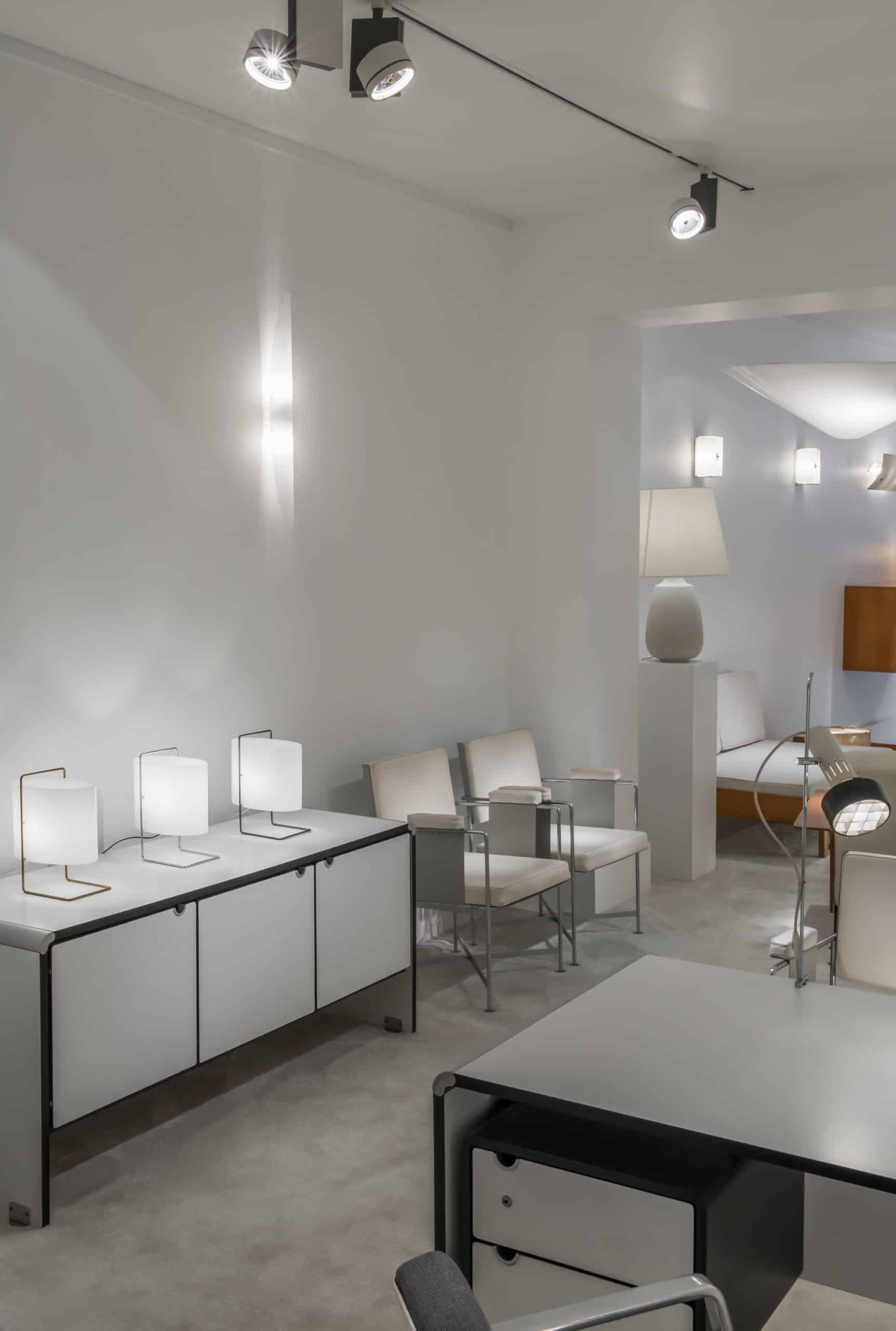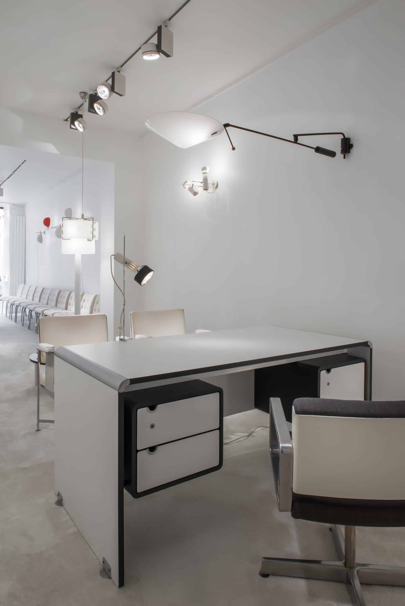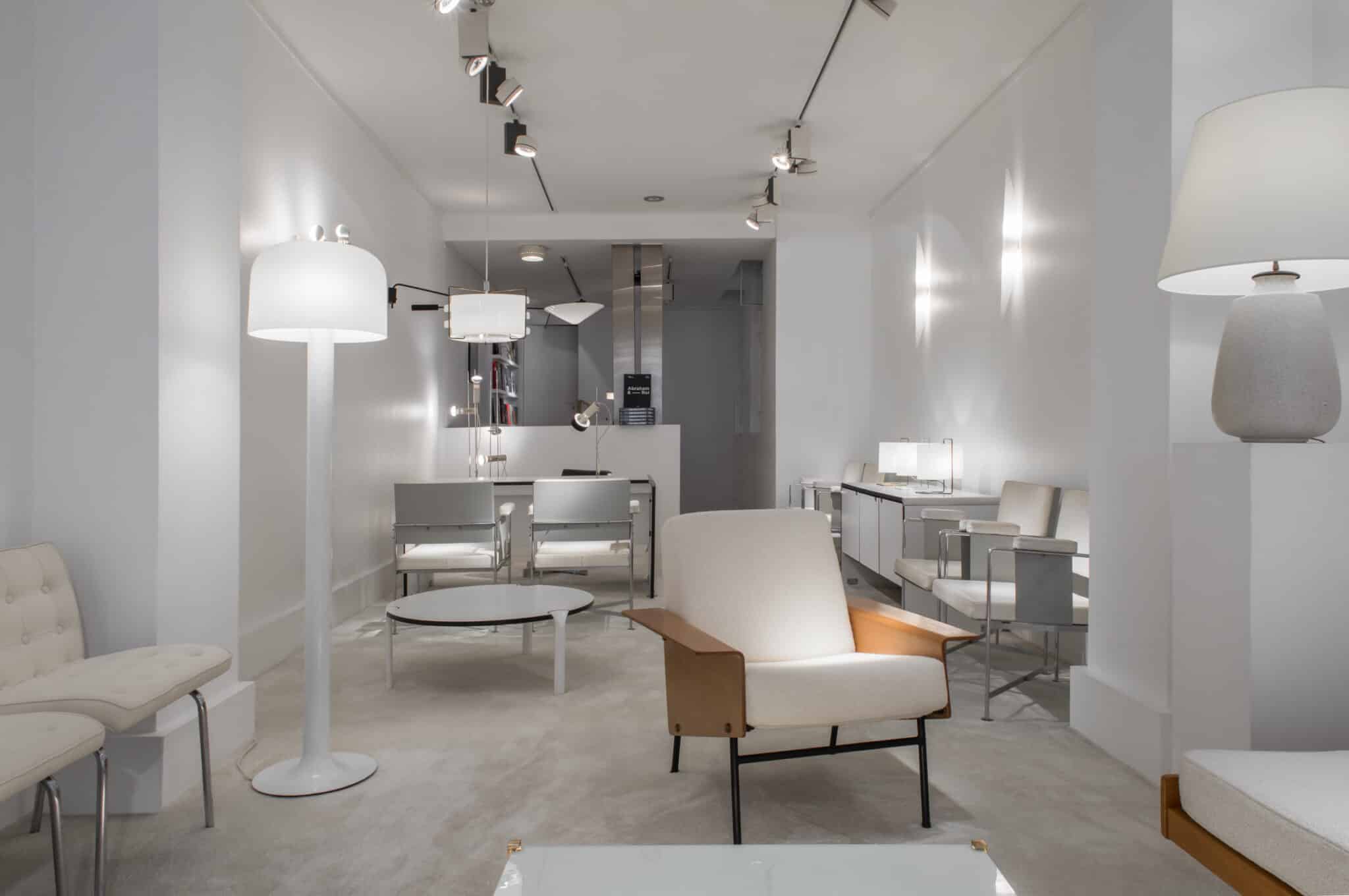Quelques pièces remarquables étaient présentées tels que six fauteuils du Paquebot France par Jacques Dumond en tôle laquée gris perle et skaï blanc d’origine, une rare paire d’appliques « M11 » en plexiglas moulé de Joseph-André Motte en 1959, un exceptionnel lampadaire « fontaine » de Michel Mortier en 1972, une paire inédite d’une chauffeuse SS1 de Pierre Guariche ou un très beau bureau de l’A.R.P. en frêne et fer laqué blanc pour annoncer l’exposition sur ce premier collectif français qui suivra immédiatement cette présentation.