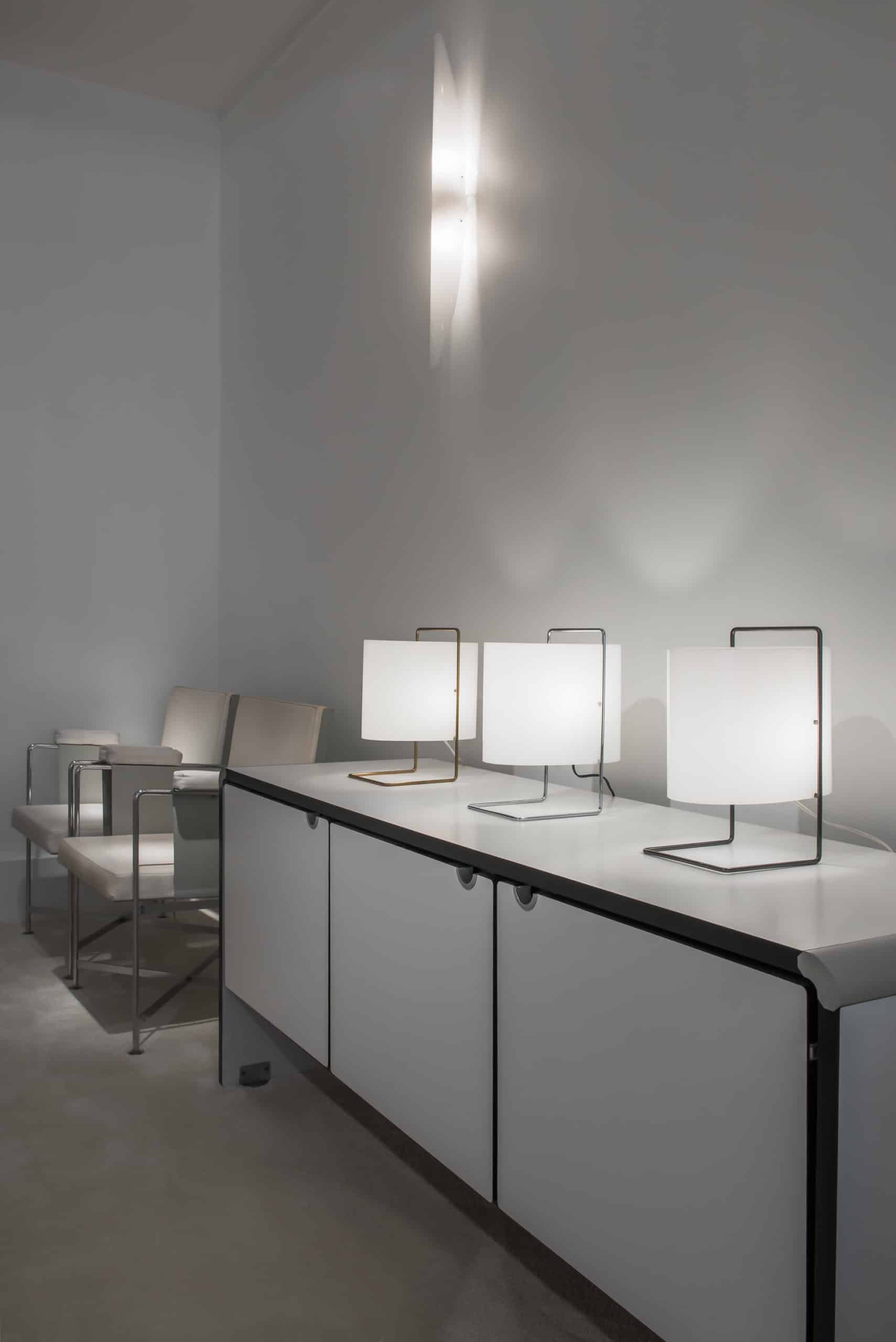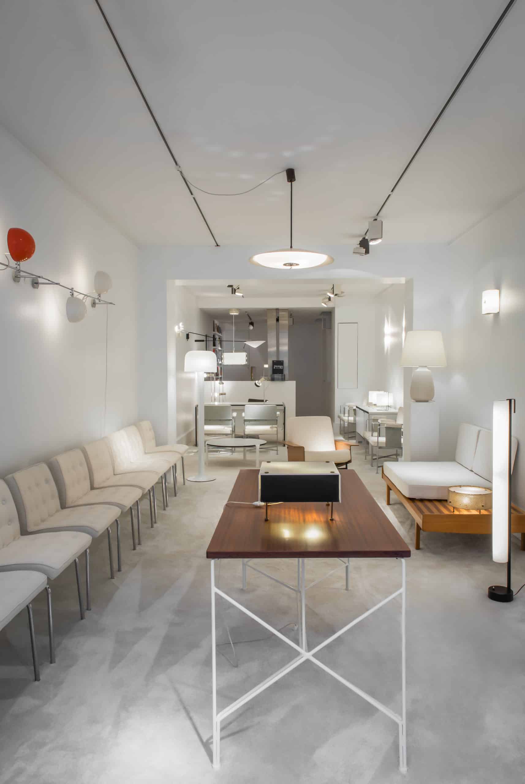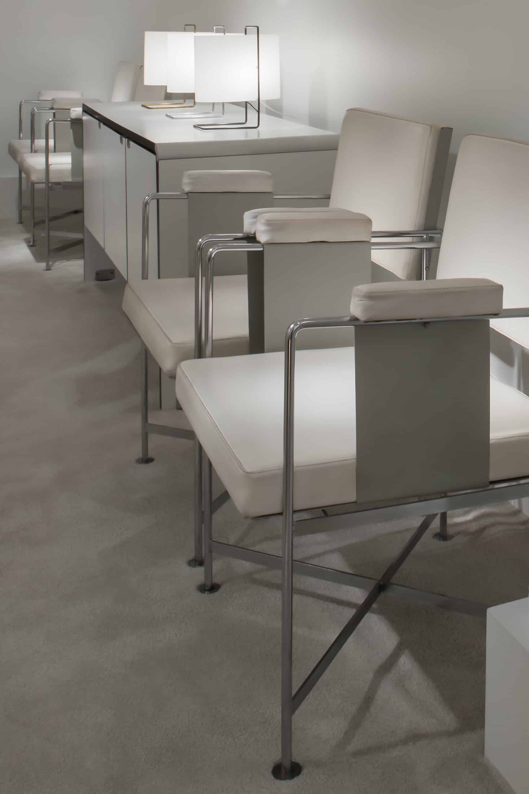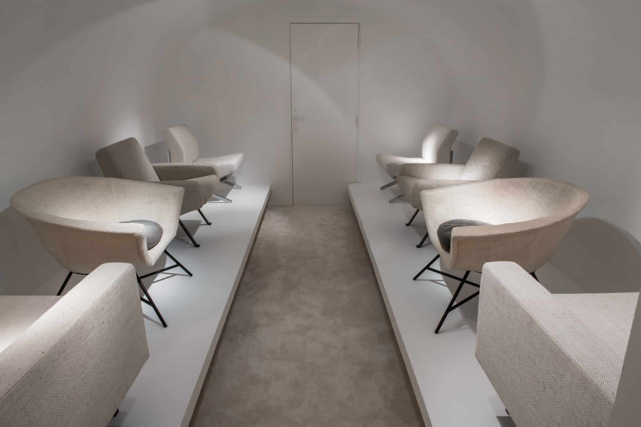 Quelques pièces remarquables étaient présentées tels que six fauteuils du Paquebot France par Jacques Dumond en tôle laquée gris perle et skaï blanc d’origine, une rare paire d’appliques « M11 » en plexiglas moulé de Joseph-André Motte en 1959, un exceptionnel lampadaire « fontaine » de Michel Mortier en 1972, une paire inédite d’une chauffeuse SS1 de Pierre Guariche ou un très beau bureau de l’A.R.P. en frêne et fer laqué blanc pour annoncer l’exposition sur ce premier collectif français qui suivra immédiatement cette présentation.