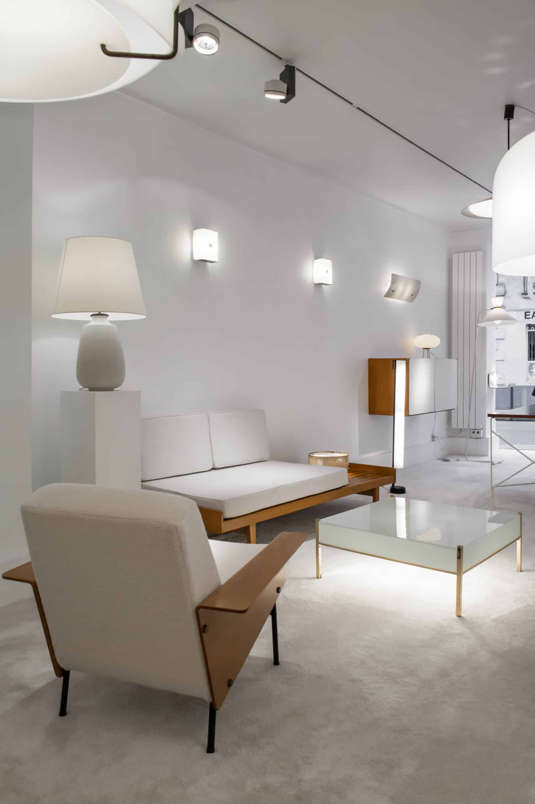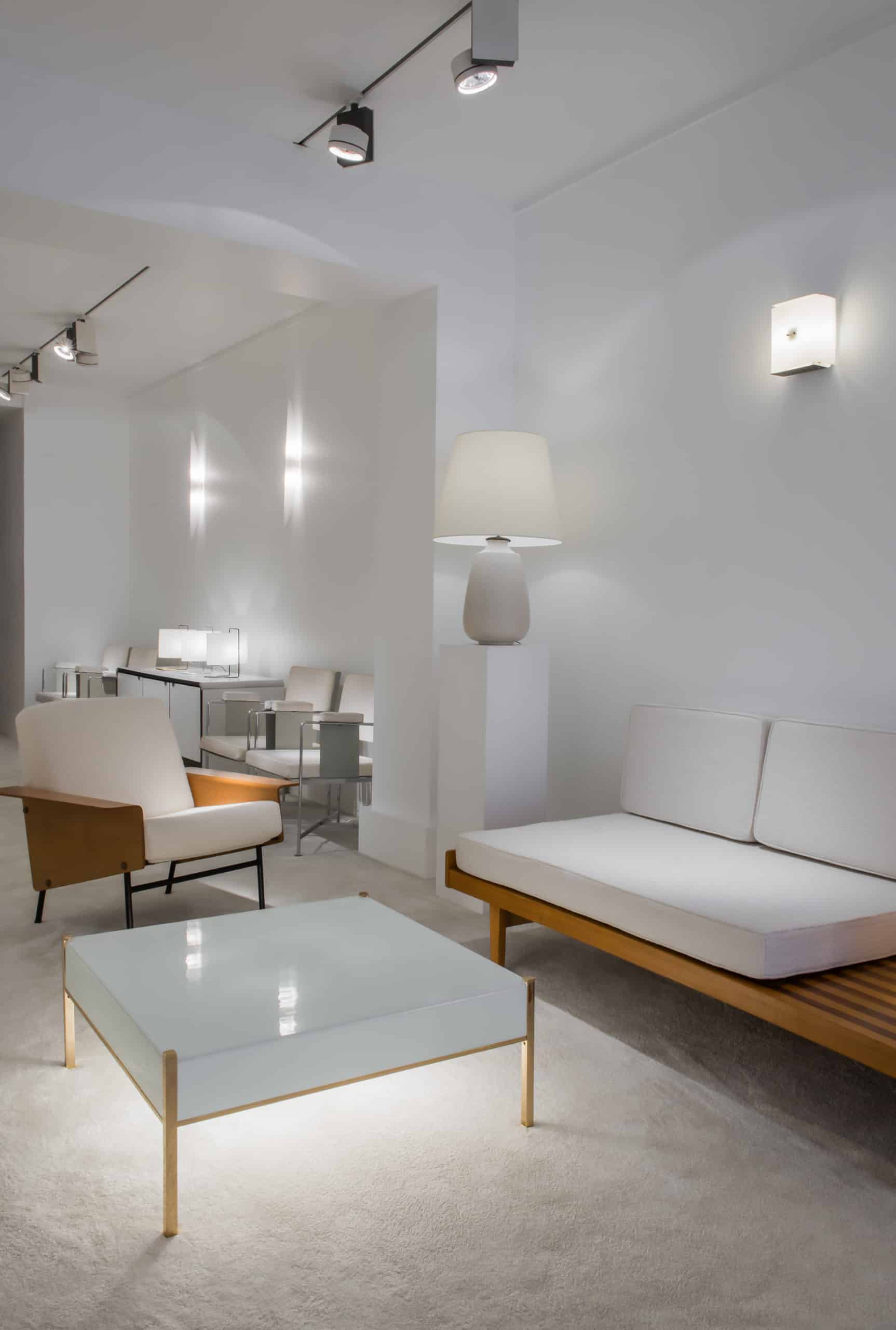 Si les années 50’ en France s’identifient souvent au piètement tubulaire laqué noir, les exceptions ne manquent pas et de nombreux meubles, sièges ou luminaires ont eu une version blanche au tout début des années 50 mais aussi à la charnière avec les années 60’. Cette non-couleur capable de transformer l’objet qu’elle habille grâce d’abord à la laque, qui couvre le métal des piètement des premiers meubles de Philippon Lecoq puis ceux de l’A.R.P., les tôles perforées des luminaires de Pierre Guariche ou ceux d’Alain Richard. Mais le blanc recouvre aussi meubles et tables basses grâce au stratifié ou à l’opaline, enfin il créé une lumière subtile par l’introduction du plexiglas dans le luminaireà partir de 1958.