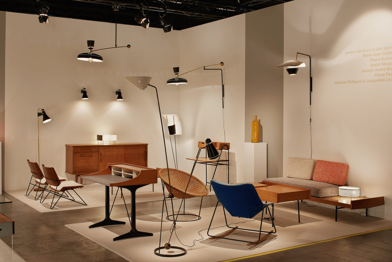 Cette collection était mise en scène de manière très muséale autour de quatre scènes reprenant le même motif en miroir : un bureau, deux fauteuils, une table basse, un meuble et trois luminaires parmi les plus exceptionnels du jeune design français des années 1950 à 1960.