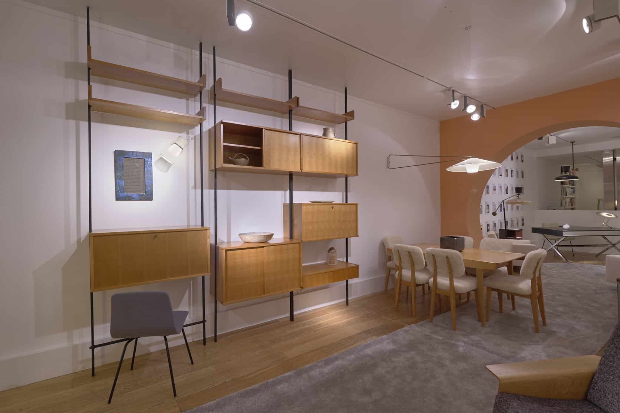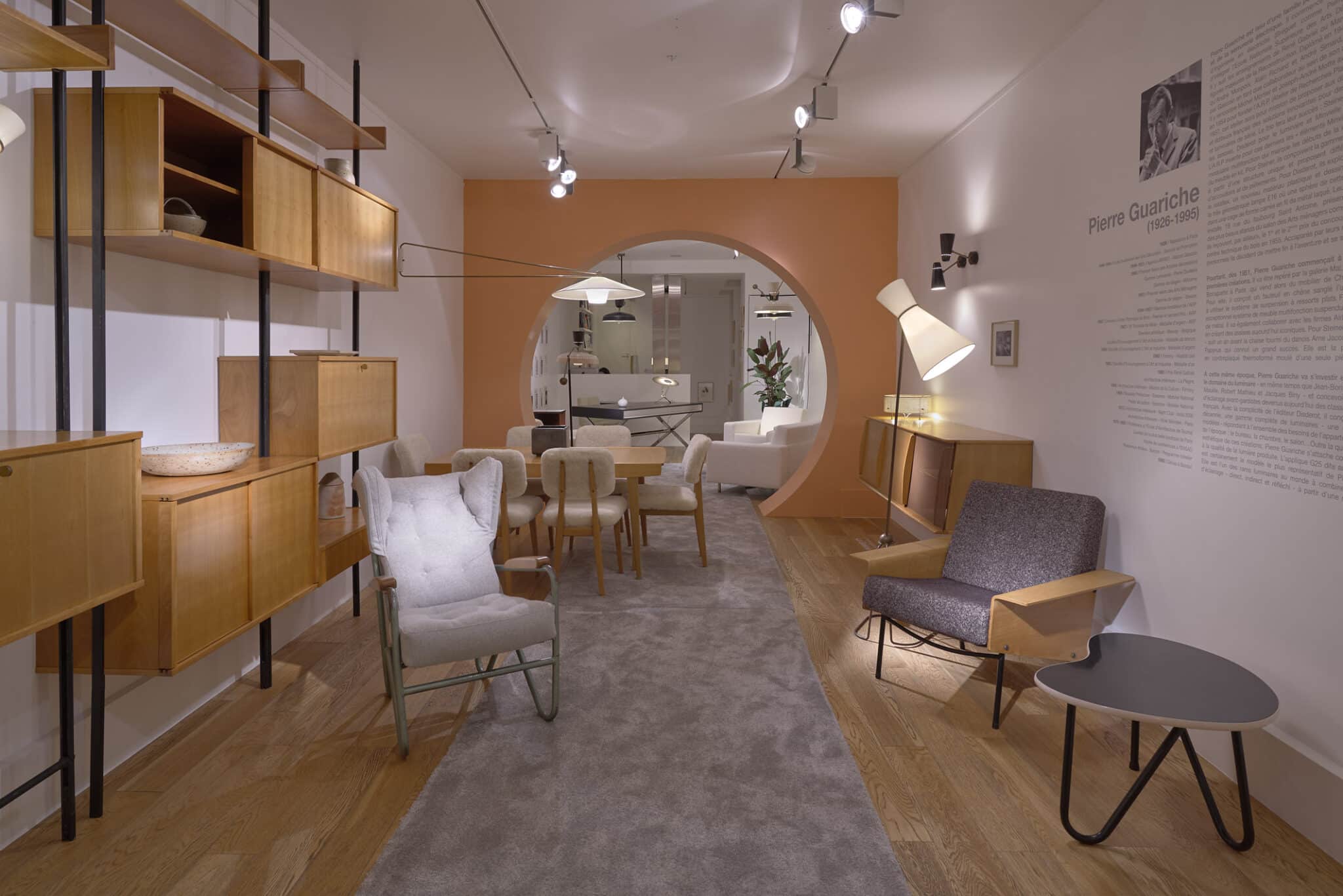 Il s’agit probablement d’une des premières fois où l’on rend hommage à La galerie MAI (Meubles Architectures Installations), sise rue Bonaparte. Elle défendit pourtant, des années 40’ à 80’, la création contemporaine en matière de design y compris international. Le chapitre Galerie MAI ouvre l‘exposition car c’est elle, qui édita les premières pièces de Guariche dès 1951. D’abord une belle et rare salle à manger complète d’origine dont la façade en bois est découpée en 3 portes coulissantes, dont une en métal perforé. Il s’agit d’un des seuls exemplaires connus de ce meuble en version suspendue. Le premier lampadaire de Guariche, le G2 (le simple balancier) est montré avec un fauteuil préfacto.
