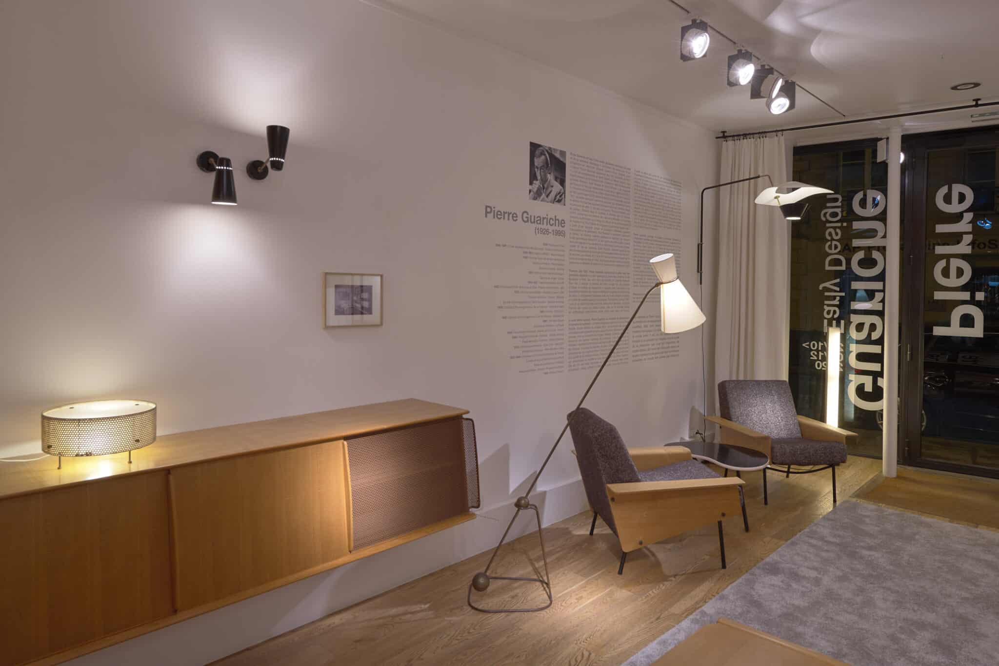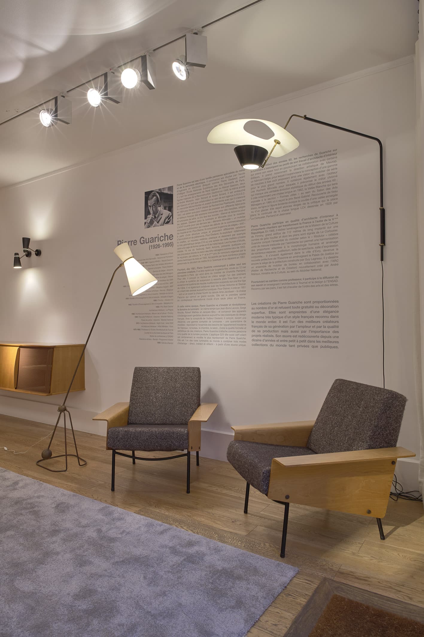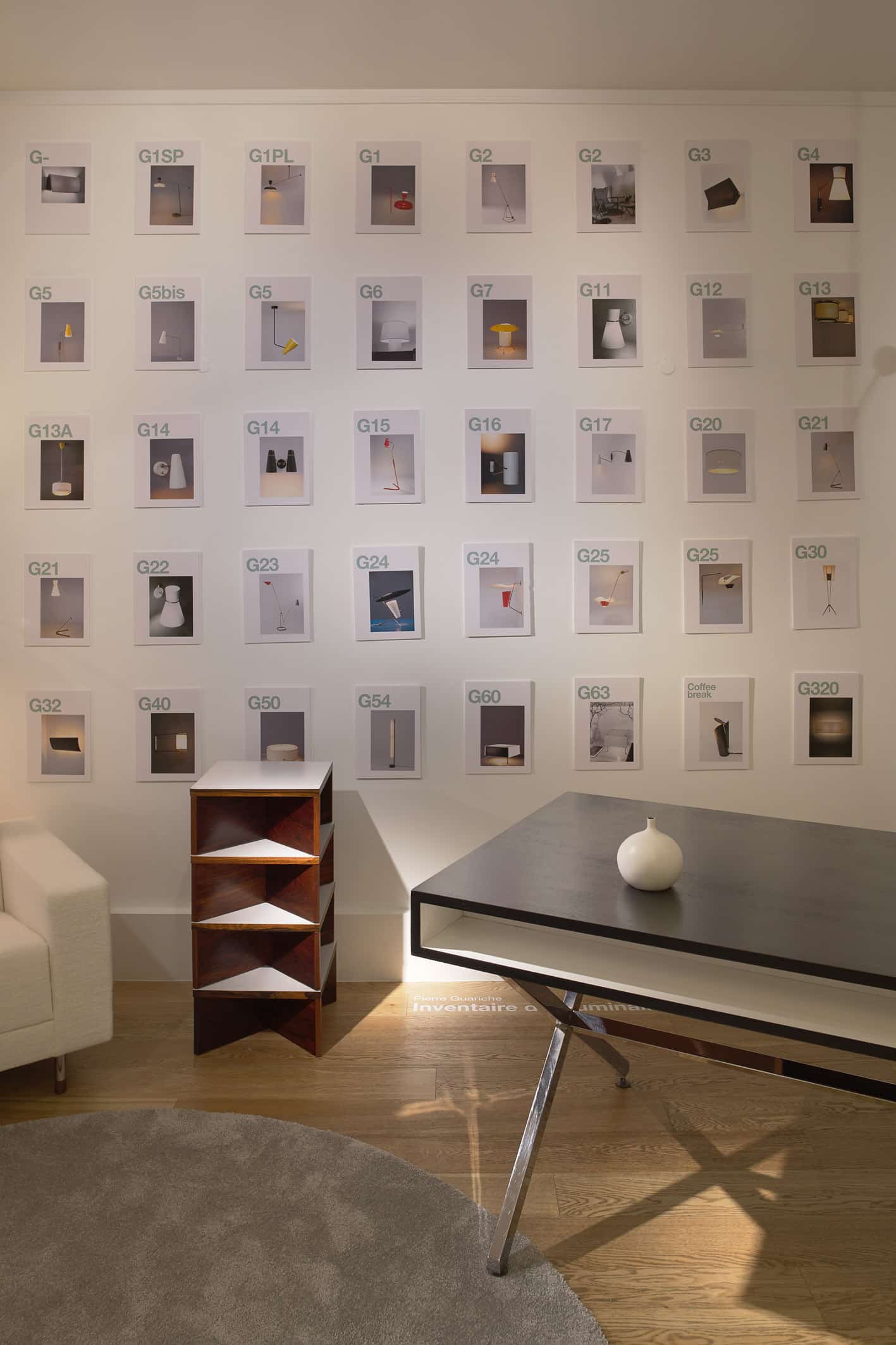 Evidemment la galerie ne pouvait faire une exposition sur Guariche sans les luminaires. Ils ont fait sa célébrité dans le monde entier. La galerie fut la première à identifier, depuis vingt ans, et à montrer en 2012 la collection complète de ses appareils d’éclairage. Un des murs est d’ailleurs recouvert de l’inventaire complet des luminaires de Pierre Guariche et un autre d’un ensemble de photos originales issues des archives de la galerie MAI et rachetées par la Galerie. Une sélection de ses plus beaux et plus rares appareils d’éclairage est disséminée dans l’ensemble de l’exposition comme la très belle et rare lampe de bureau G24, deux appliques encore jamais vues (G11 et G22) , et bien sûr, les plus connues comme la G25 dites « Cerf volant », la gamme complète des G1 à contrepoids etc.