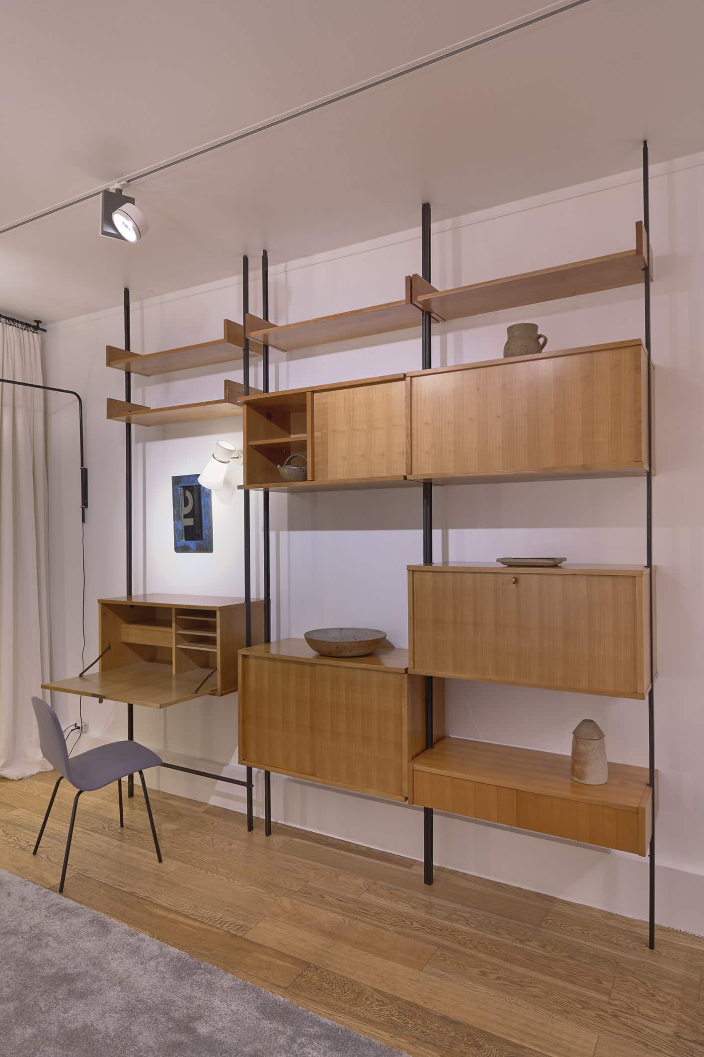Cette célèbre série en tube métallique réutilise des techniques issues des recherches de la guerre pour innover dans le meuble comme l’a fait aussi l’industrie automobile. Enfin, le meuble combinable, pour la galerie MAI présenté pour la première fois au public ! Il s’agit là d’une véritable révolution dans le mobilier, où Pierre Guariche montre déjà toute son ingéniosité et son élégance esthétique. Les prix sont malheureusement très élevés à la Galerie Mai et il faudra un autre directeur pour qu’elle connaisse un véritable succès. Les pièces de Guariche n’y seront vendues que de manière confidentielle, elles sont aujourd’hui devenues muséales.