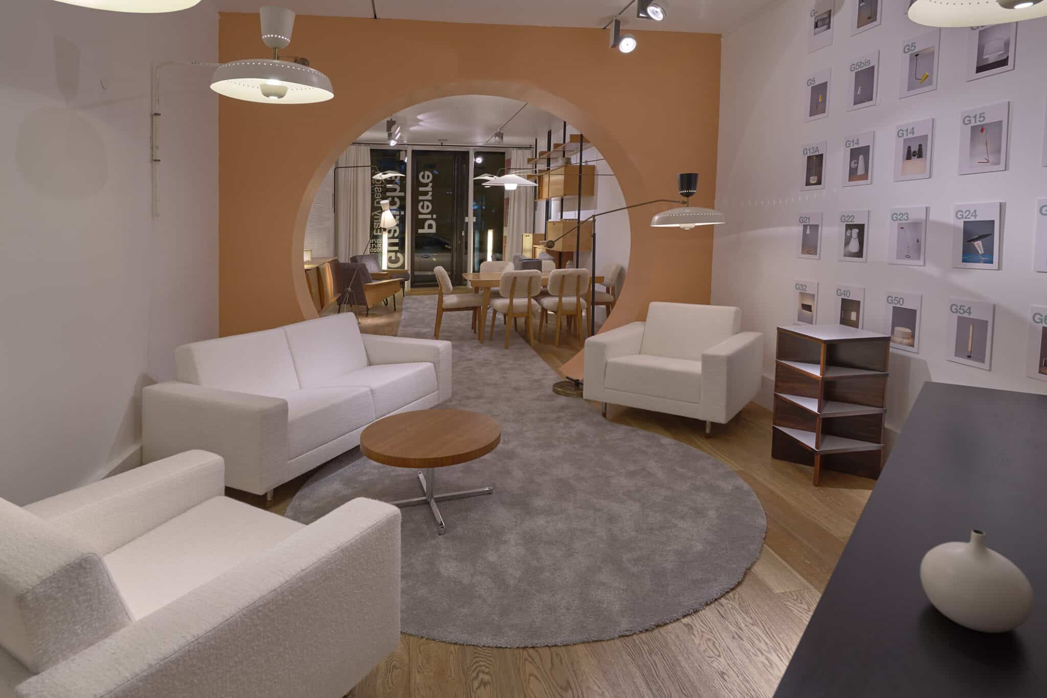 Le troisième éditeur sélectionné par Pascal Cuisinier, les Huchers-Minvielle représente la grande modernité française du début des années soixante. Dix ans après la galerie MAI, le style de Guariche s’est affirmé, simplifié, modernisé. Il utilise désormais les bois foncés, le chrome, le stratifié blanc, les lignes radicales épurées à l’extrême. Les proportions toujours très sophistiquées sont plus amples, plus généreuses, plus riches. En effet, l’époque est plus faste, le développement économique s’accélère et la classe moyenne s’installe quand le secteur tertiaire ouvre de nouveaux horizons aux patrons et aux managers. Ce troisième espace d’exposition présente donc le seul bureau de la gamme PDG connu, avec son retour suspendu sans piètement ainsi que l’un des deux salons FG2 club jamais sortis sur le marché. Les lignes sont minimales, chics et intemporelles et destinent ces meubles autant à la maison qu’au bureau, autant aux années 60’ qu’à aujourd’hui.